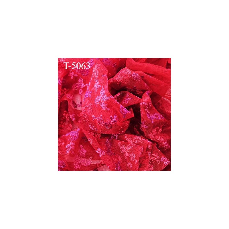 Tissu dentelle brodée couleur rouge et violet sur tulle très haut de gamme largeur 135 cm